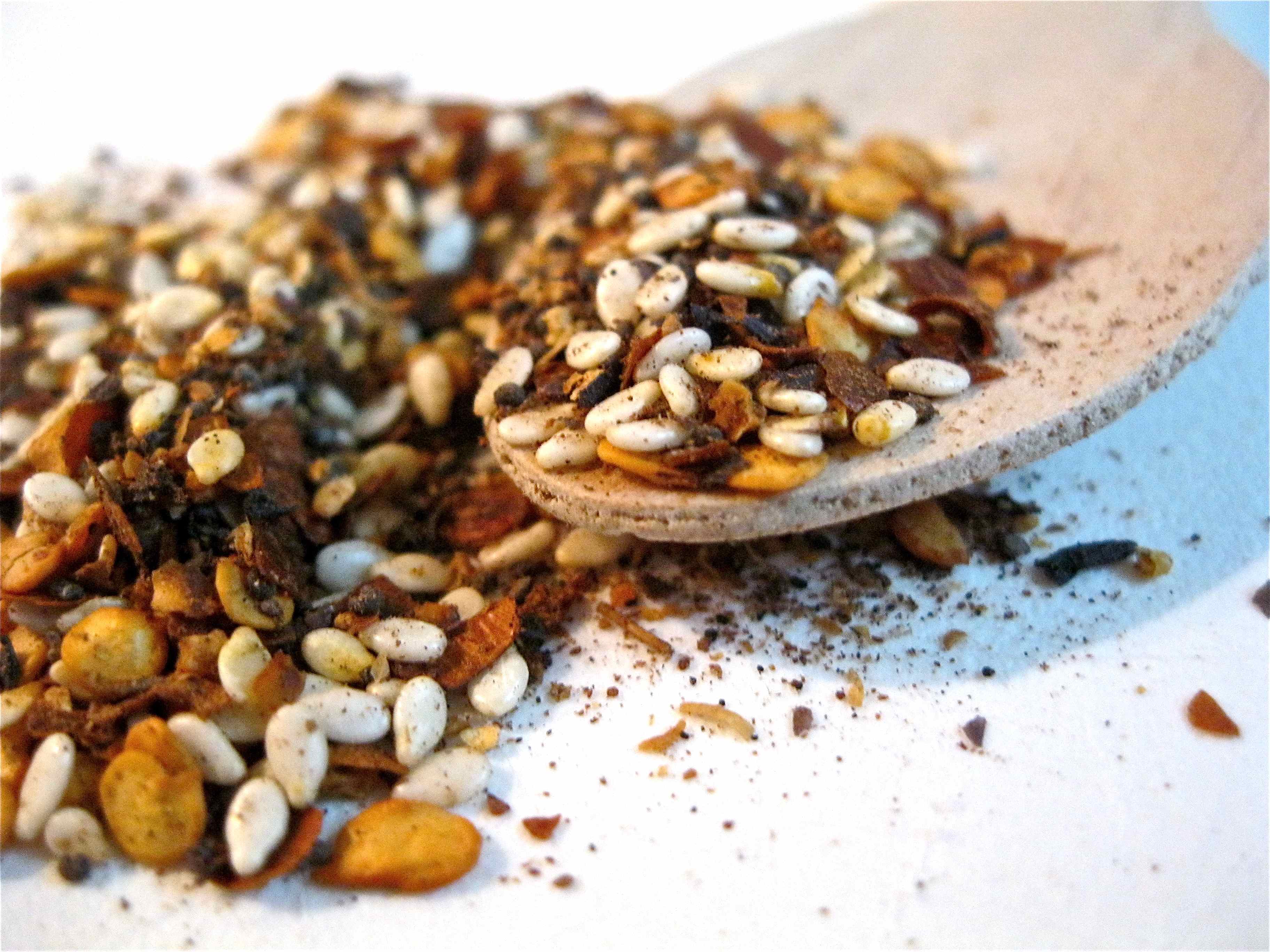 Partenza, le spezie Shichimi Togarashi: si comprano già miscelate (Cannamela, all’Esselunga) ma, amando il fai da te (e per un gusto facilmente più fresco), penso che si possano assemblare mescolando, suppergiù in parti uguali, semi di sesamo non tostati, peperoncino secco sbriciolato, scorza d’arancia grattugiata, pepe di Sichuan frantumato (o il più comune pepe nero, purché macinato molto grossolanamente, a mio avviso), semi di papavero e, per non farsi mancare nulla, alghe macinate.