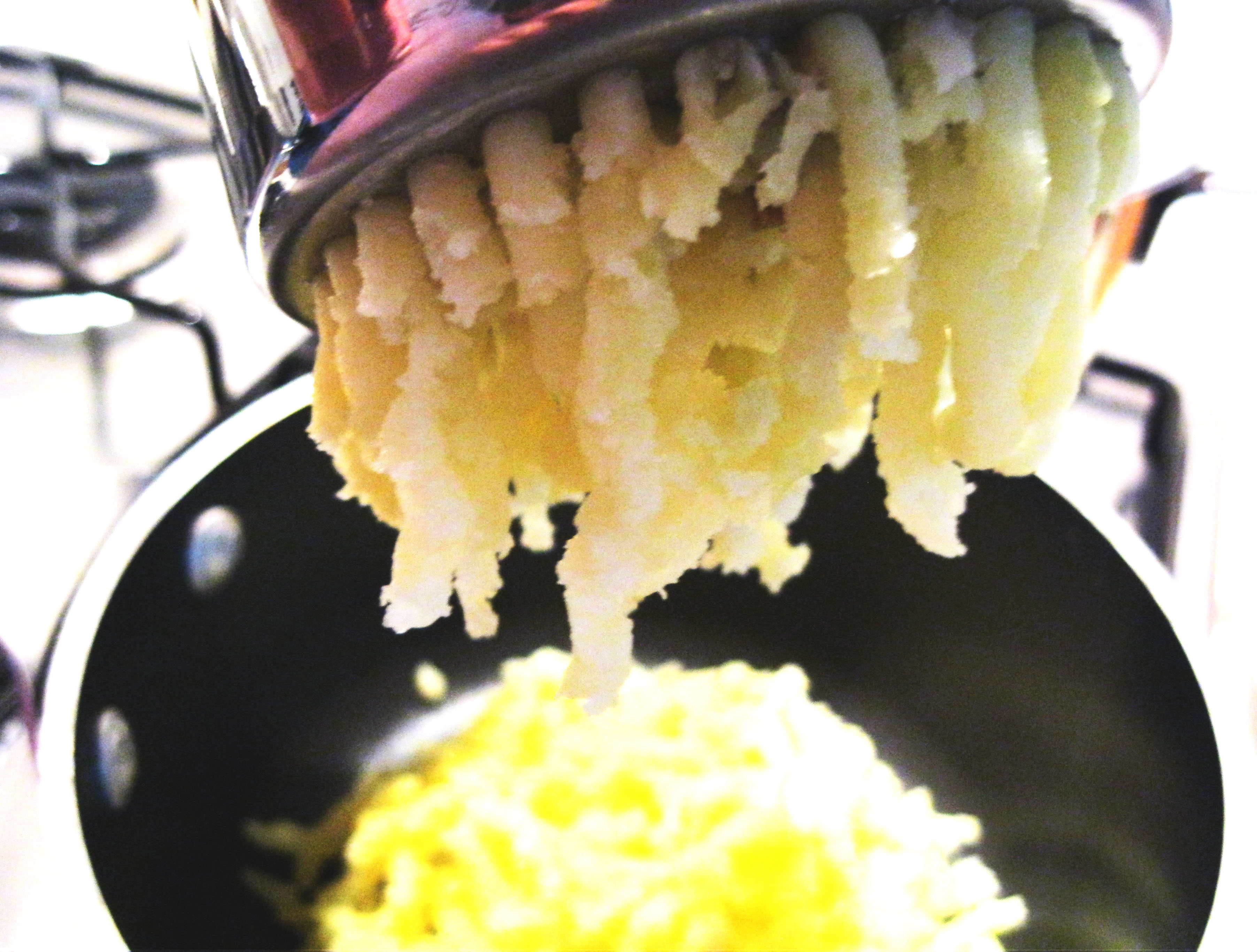 Ho passato la patata affumicata allo schiacciapatate e l’ho mescolata qualche minuto su fuoco dolce con latte a filo (circa 1 tazzina), una noce di burro, la scorza di limone e una macinata di pepe (poco, il Chipotle è piccante assai), fino a ottenere un purè molto fluido.