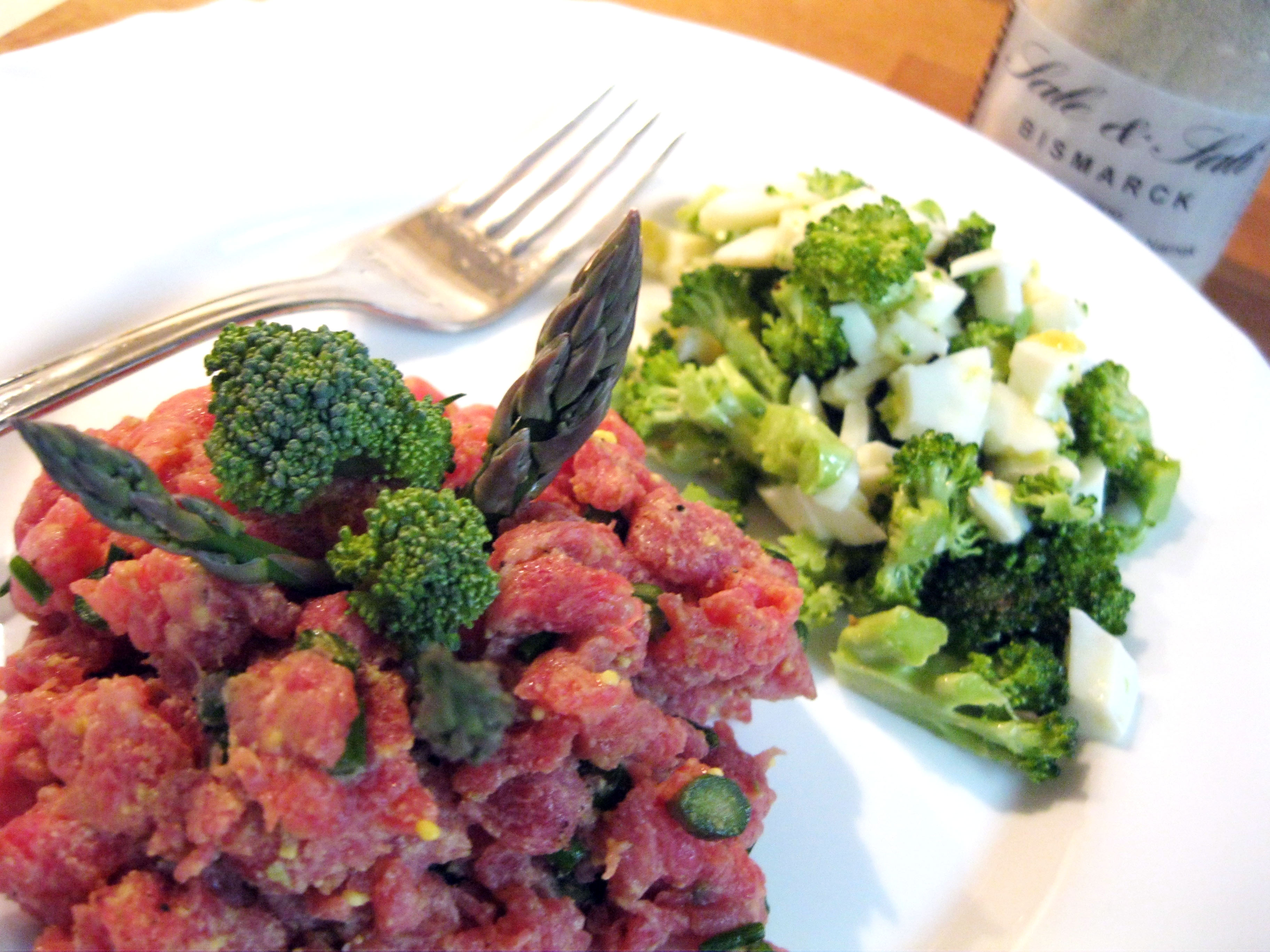 Ho tagliato a dadolini l’albume e l’ho unito alle crudité. Ho affettato la carne sottile, poi ho ridotto le fettine a striscioline, quindi le striscioline a dadini e infine ho battuto tutto al coltello (per la “grana” della tartare vedete voi, a me piace un po’ grossolana).
